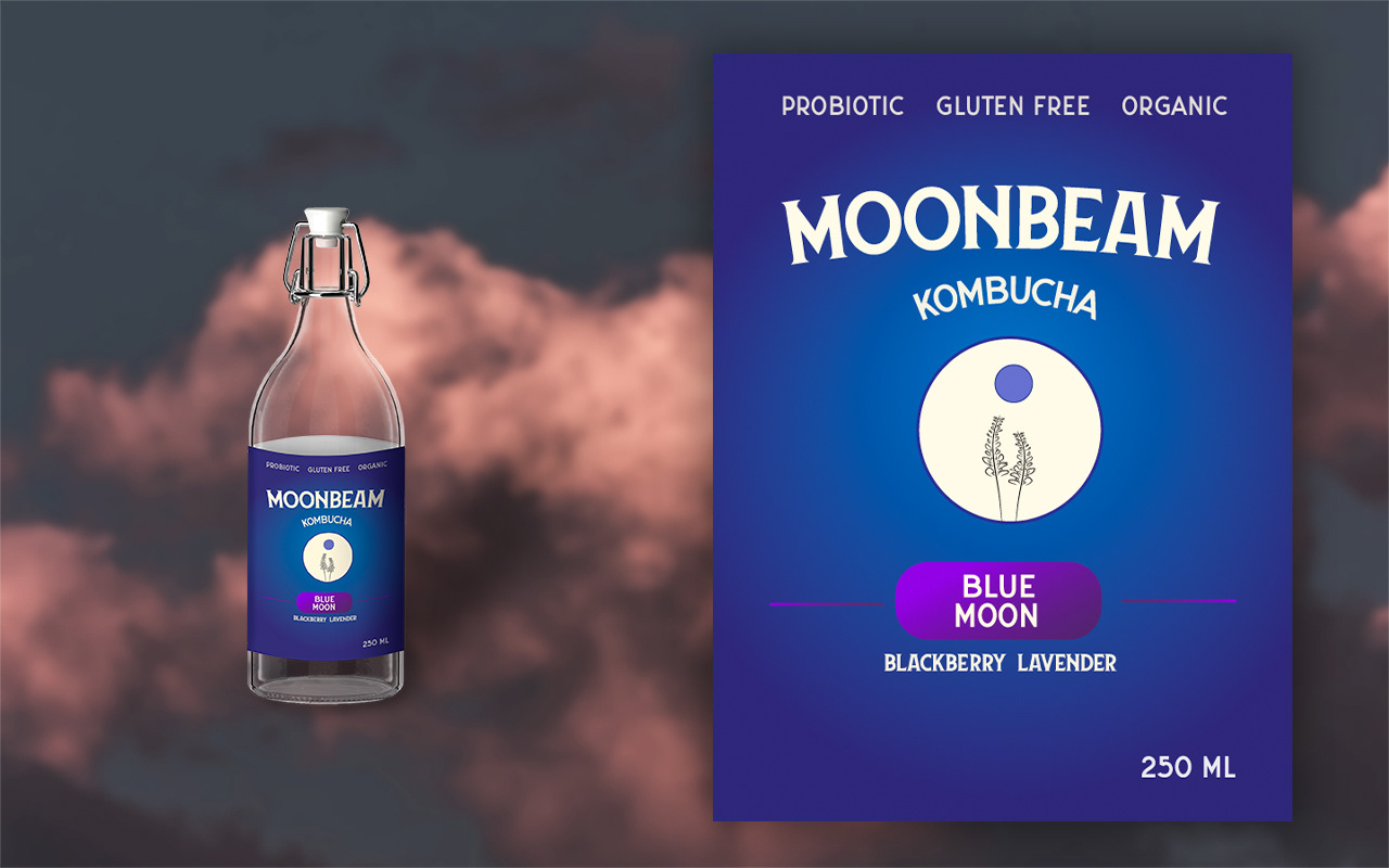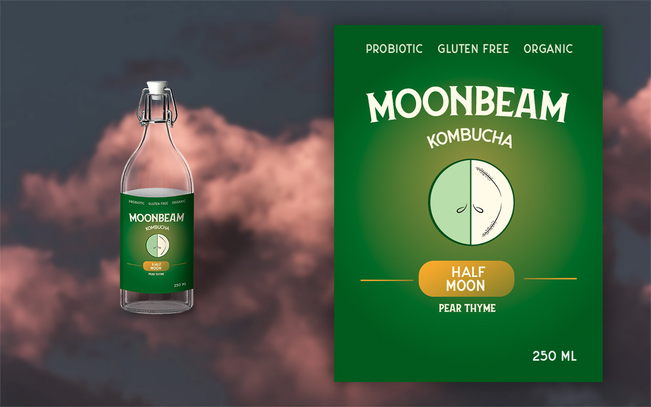 Moonbeam is a selection of kombuchas with flavours taking name from lunar phases. Each phase has flavour that mimics how the fruit is naturally formed and sectioned, coupled with a botanical element.
